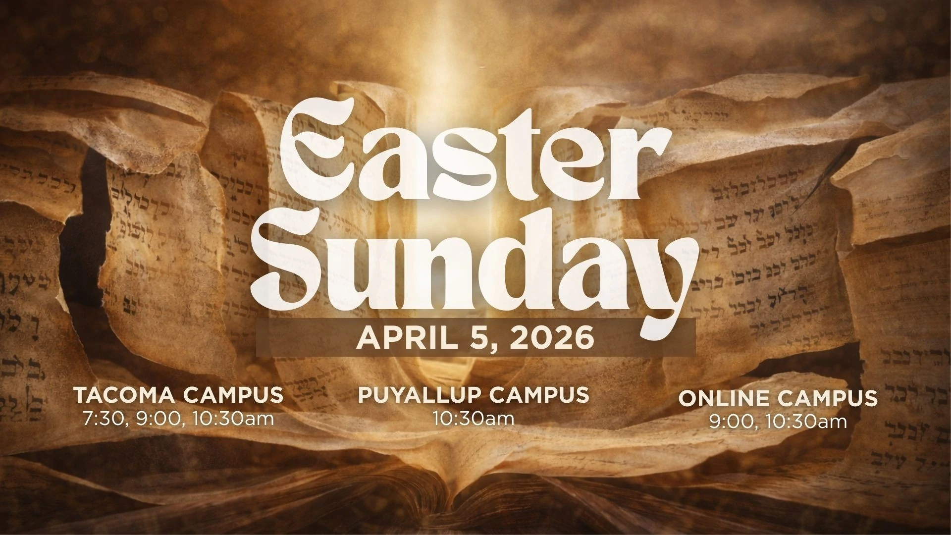 Join us on Sunday, April 5 for our Easter Sunday celebration! Tacoma Campus7:30, 9:00, 10:30am Puyallup Campus10:30am Online Campus9:00, 10:30am - watch the live stream here. What to expect?On Easter Sunday, we will lift up songs of praise and adoration led by our worship team. We will pray, hear God's Word, listen to an inspiring message, and enjoy fellowship with one another. Families will worship together, as there is no Kids Connect on Easter.At the Tacoma Campus, Nursery care for infants through age three is available at 9:00 and 10:30am. Interested in Holy Week Services?Learn more about our Holy Week services here.