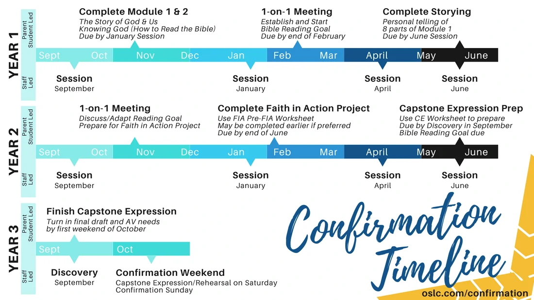 Here is a timeline for Confirmation. This is designed to help give parents and students an overview of deadlines and how the experience progresses over the two years. As always, students can work ahead of the due dates on the timeline if preferred.